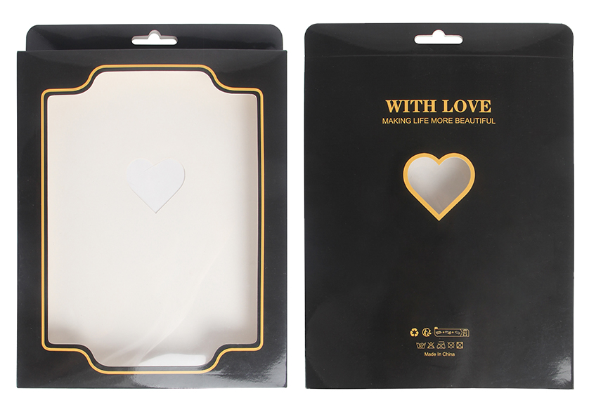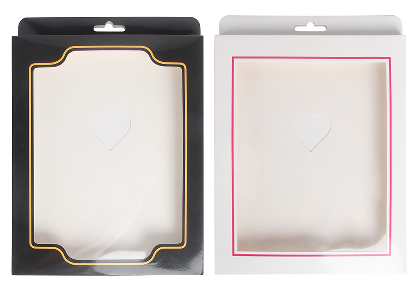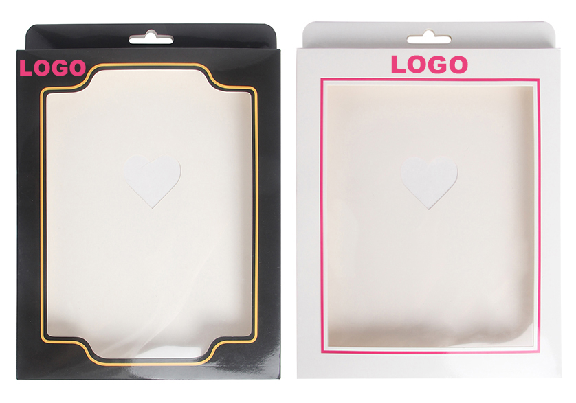 Paper material, no logo, black/white two different styles; 3 common layouts (lingerie,bodystocking/stocking,underwear) and 2-3 different thicknesses, a total of 9-10 different specifications to suit different category products. Universal box is available in stock, no MOQ required, with uniform price $0.4/pc |