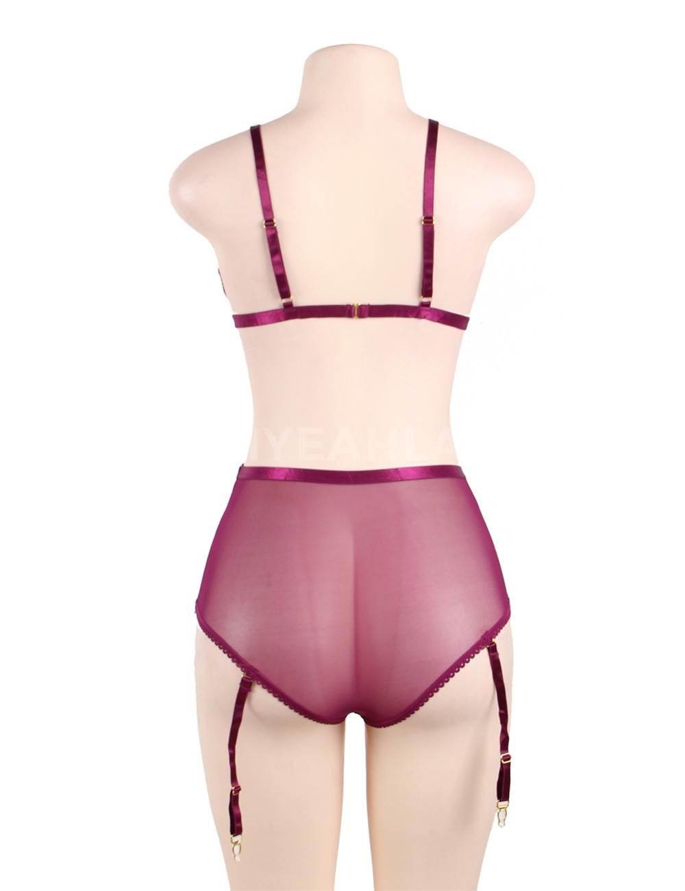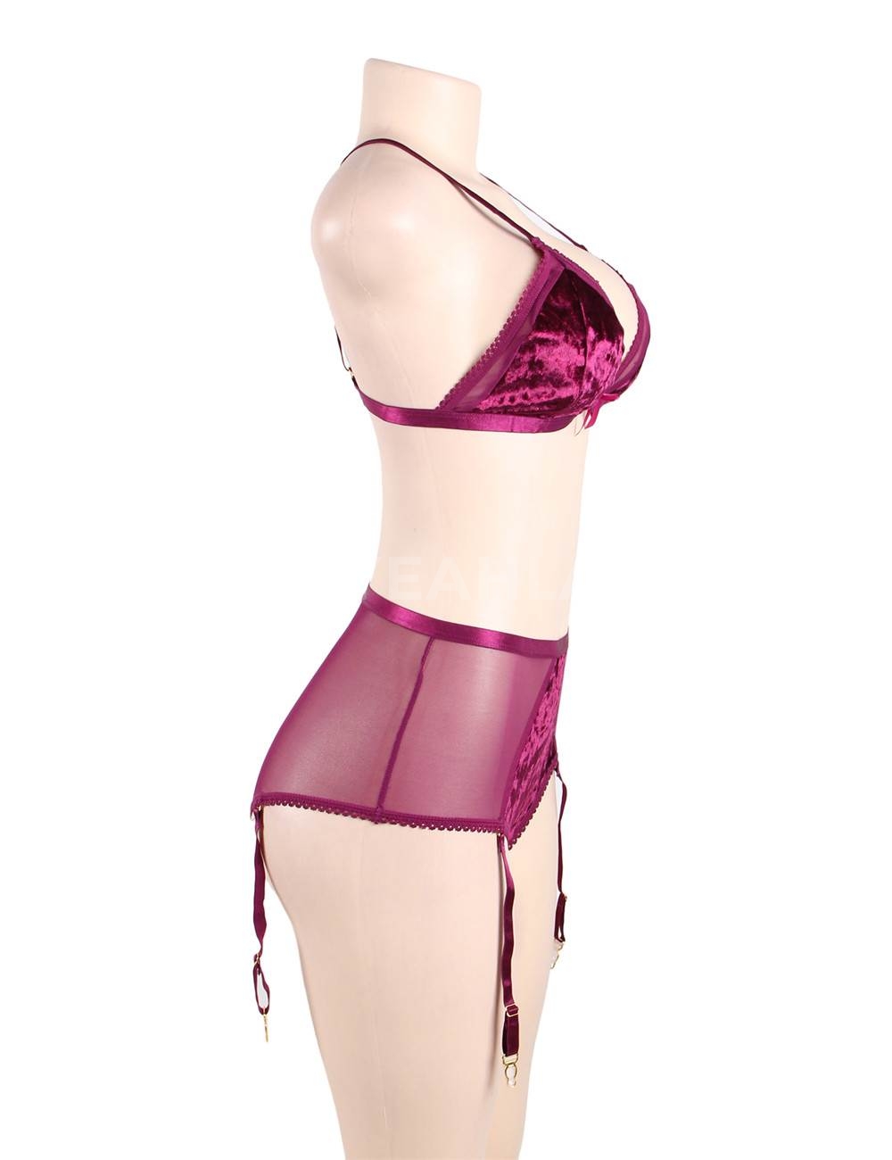 Standard Product Name: Purple, mesh splicing velvet, nine-button design at the back, adjustable bust size, adjustable shoulder straps, mid-high waist style, four detachable garter belts, S-5XL plus size, women`s garter lingerie set.