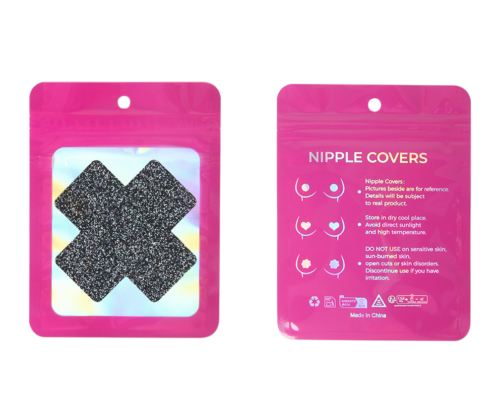 Standard product name: Black, leatherette, large cross, ultra-thin seamless, glue-free in sensitive area, one size, disposable black large cross nipple covers.
