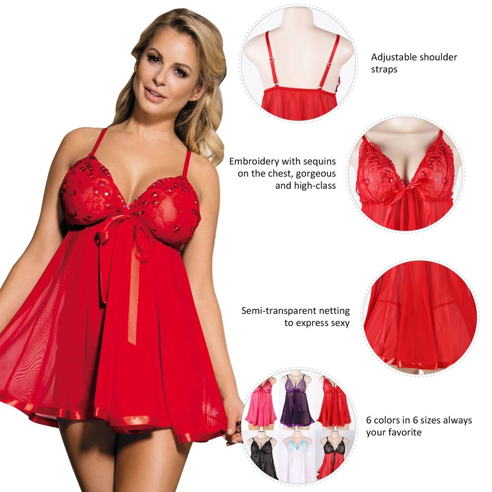 Introducing the latest addition to the ohyeah company’s lingerie collection, the E20736P. This babydoll lingerie is designed specifically for plus-size women and is a true embodiment of seduction and glamour. The lingerie features adjustable shoulder straps, intricate embroidery with shimmering sequins, and semi-transparent mesh material. One of the standout features of the E20736P is its adjustable shoulder straps. This allows women of different shapes and sizes to wear the lingerie comfortably and confidently. With its smooth adjustability, women can customize the fit of the lingerie to their liking and ensure that it accentuates their curves in all the right places. The E20736P also boasts an exquisite design that features delicate embroidery and shimmering sequins at the bust. This elegant embellishment adds a touch of sophistication and luxury to the lingerie, making it perfect for special occasions or intimate moments. The semi-transparent mesh material used in the E20736P further enhances its seductive appeal. The sheer fabric allows just enough skin to be visible, creating a tantalizing tease that is both alluring and mysterious. To cater to women of all tastes, the E20736P is available in six different colors and six different sizes, ranging from S to 6XL. The lingerie is also available with a matching thong, creating a complete set that is both stylish and functional. In conclusion, the E20736P babydoll lingerie is a must-have for every plus-size woman who wants to look and feel sexy and confident. With its adjustable shoulder straps, intricate embroidery with shimmering sequins, semi-transparent mesh material, and range of colors and sizes, the E20736P is the perfect combination of comfort, style, and seduction.
