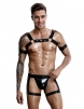 Standard product name: Black faux leather fabric, metal rings, top and underwear splicing rings, one size, men`s bondage bodysuit