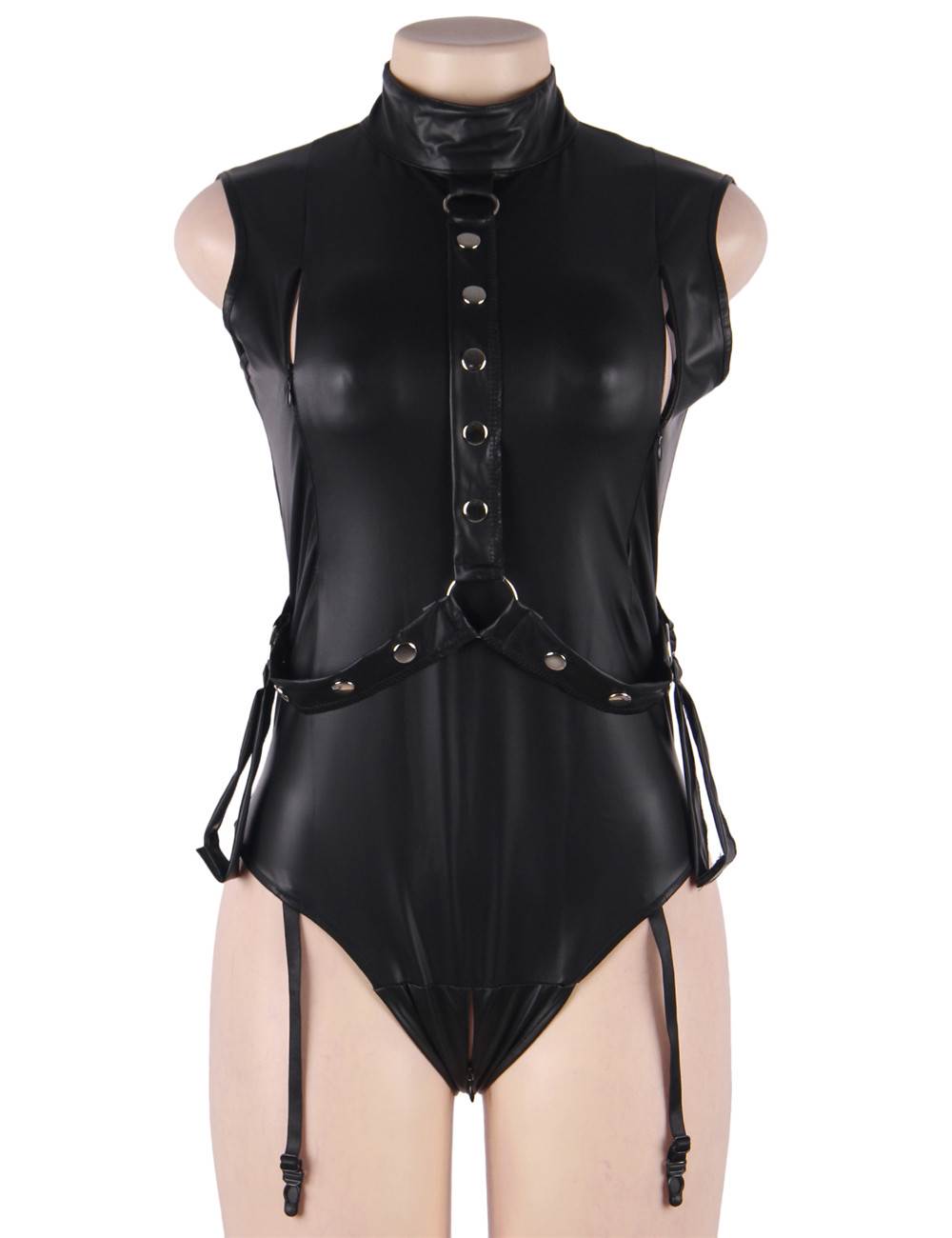 Product Name Sleeveless Bodysuit Black PU Leather Open Bust Temptation