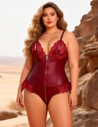 Standard product name: Available in black and red, PU leather, zip style, lace at the chest, ruffled lace at the hem, adjustable straps, M-3XL, sexy PU leather suspender bodysuit.