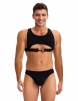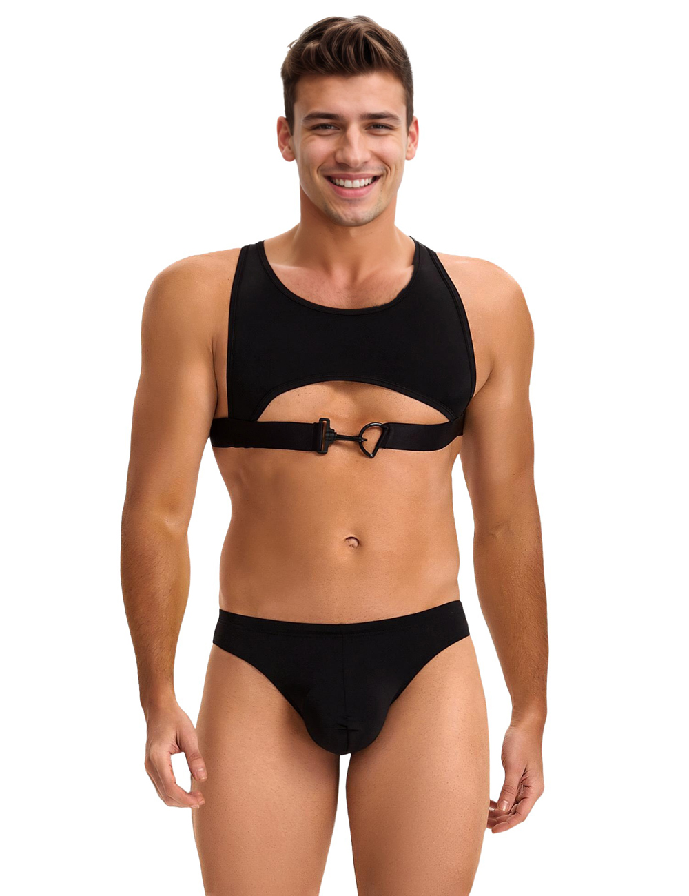 Standard Product Name: Black, ice silk fabric, hollow chest, spliced elastic band + plastic buckle, front U-shaped pouch design, widened waist elastic band, M-2XL, men`s sexy lingerie set;