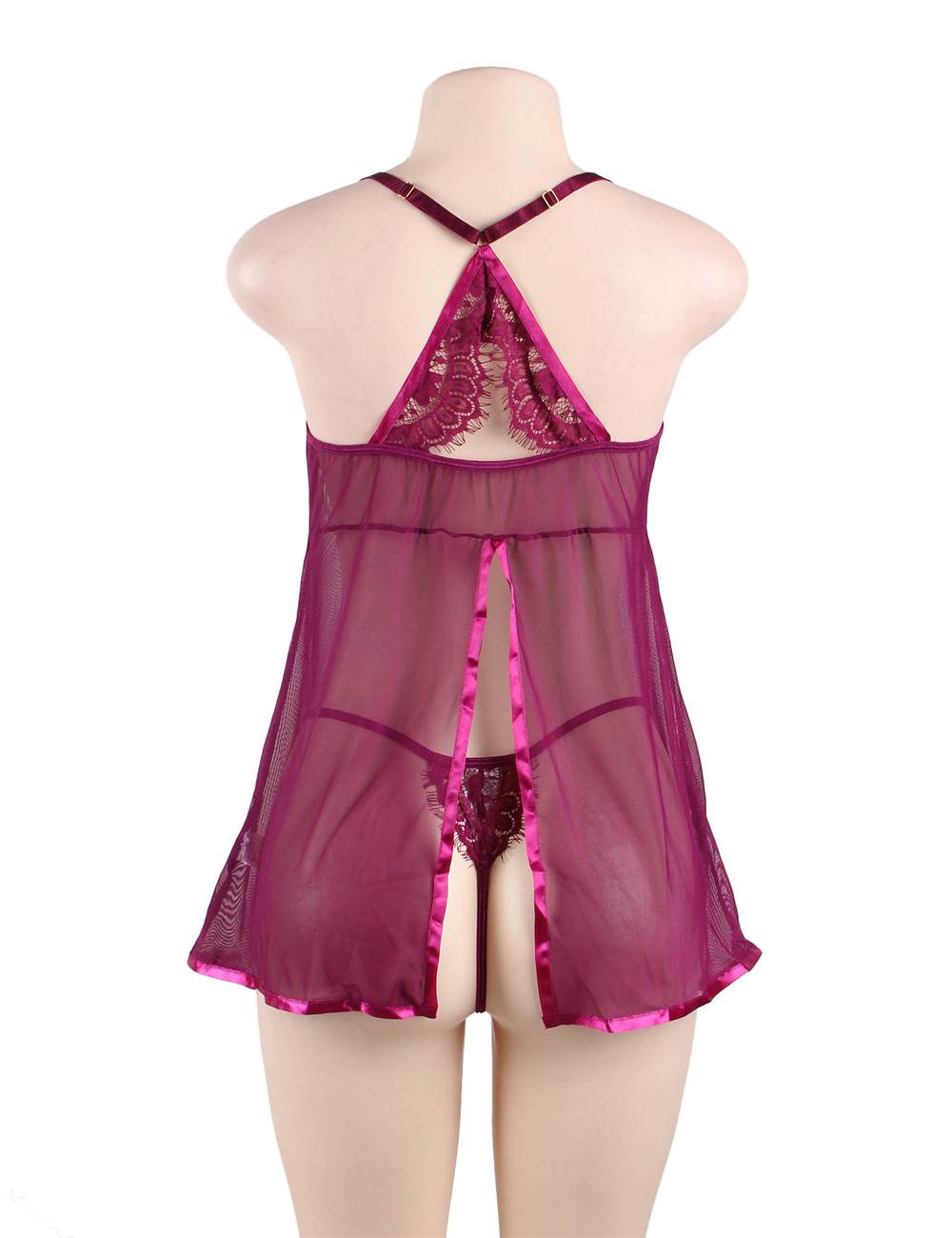 Introducing the R80602 Seductive Nightgown from OhYeah, a product that is designed to make you feel confident, comfortable and alluring. This nightgown is unique in its own way and has several features that make it stand out from the rest. To begin with, the nightgown has steel wires in the bra cups that provide excellent support and shape to your bust, giving you a flattering silhouette. The cups are made from soft and vibrant velvet fabric that feels great against your skin, adding a touch of elegance and glamour to the overall design. The edges of the cups and the back of the nightgown are adorned with delicate eyelash lace, which enhances the overall aesthetic and gives it a high-end, luxurious look. The eyelash lace detailing adds a touch of sensuality and sophistication to the design, making you feel like a goddess. The back of the nightgown features a seductive split design, which adds a playful and alluring element to the overall design. The hemline is also decorated with silk ribbons that give it a beautiful finishing touch. The silk ribbon detailing adds a touch of glamour and sophistication to the overall look, making it perfect for a special occasion. The nightgown is made from a lightweight and breathable mesh fabric, which allows for optimal comfort and movement. The adjustable shoulder straps ensure a perfect fit, and the included thong adds an extra layer of sexiness. Overall, the R80602 Seductive Nightgown is a perfect combination of style, comfort and sensuality. With its steel wire cups, velvet fabric, eyelash lace detailing, split back design, silk ribbon hemline, and breathable mesh fabric, this piece is sure to make you feel confident and alluring. It is available in a beautiful shade of purple, and the S-5XL size range ensures that there is a perfect fit for everyone. So, indulge in the luxury and elegance of this stunning lingerie piece and feel like a queen in this beautiful and fashionable nightgown.