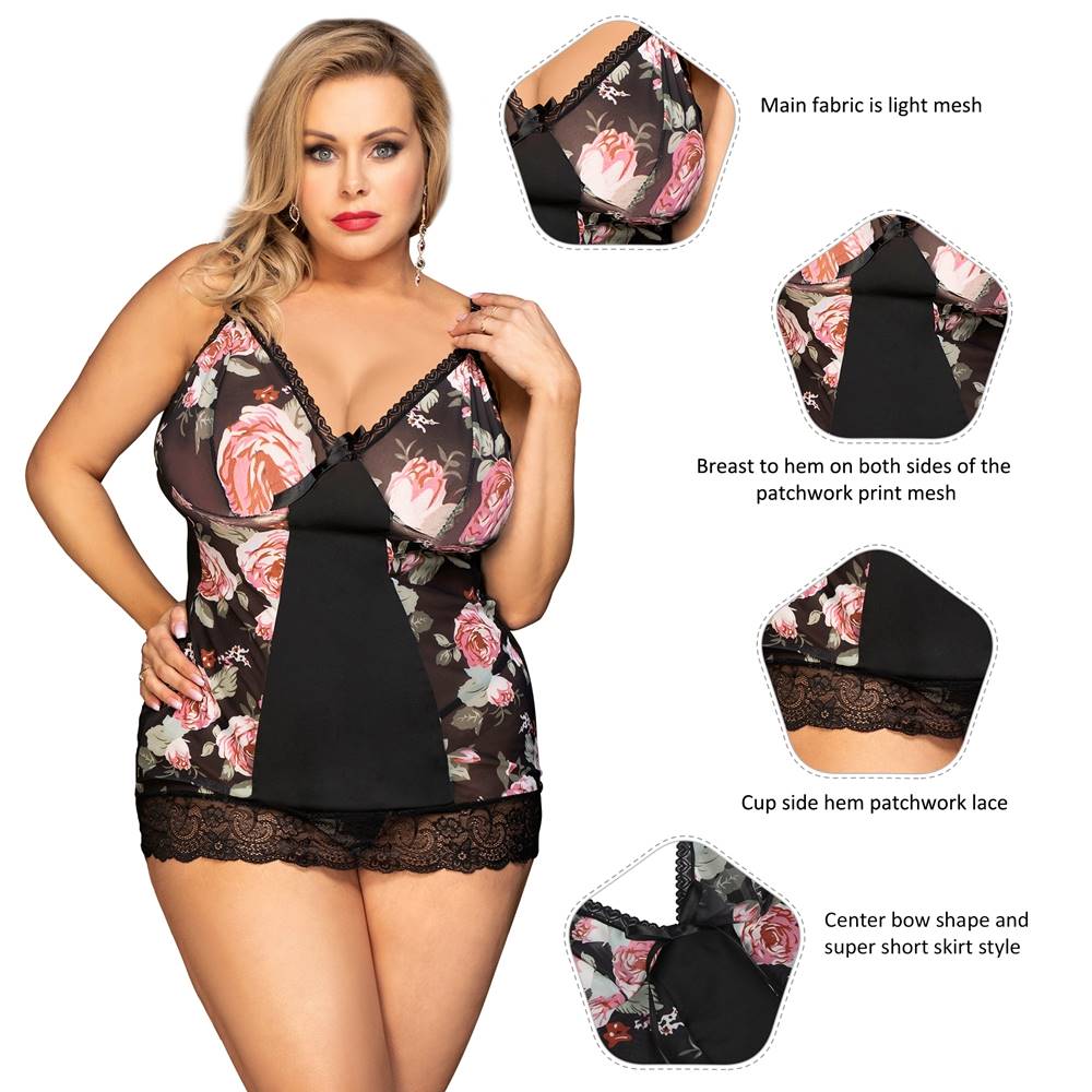 Home > Wholesale Plus Size Lingerie > Plus Size Floral Print Lace-up Babydoll Without Underwire