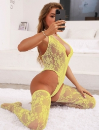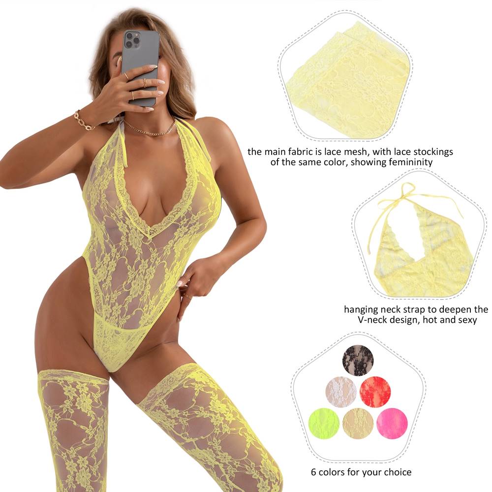 Product Name Sexy Yellow Halter V Neckline Lace Plus Size Teddy with the Stocking