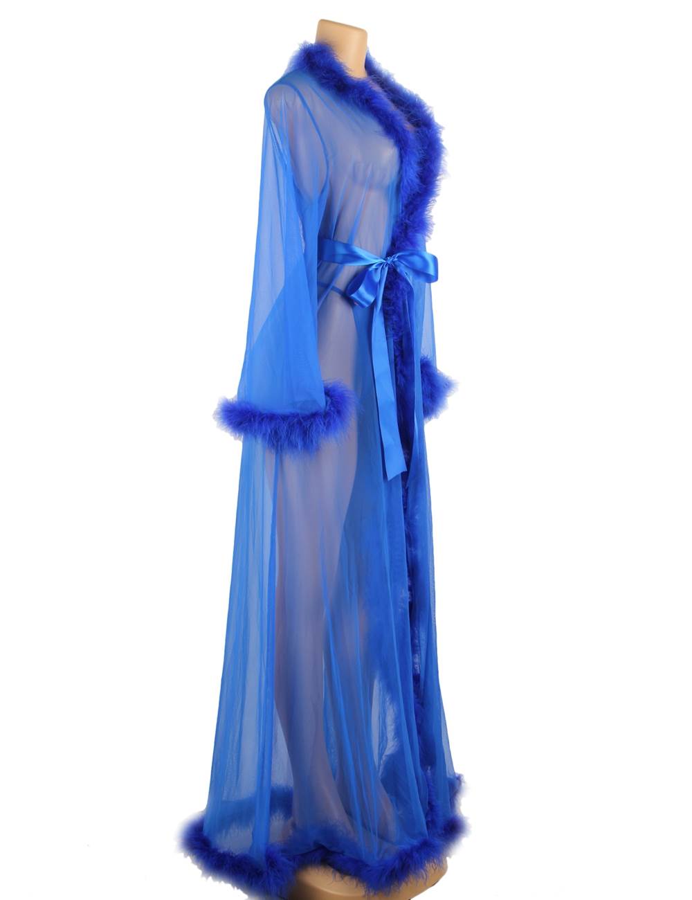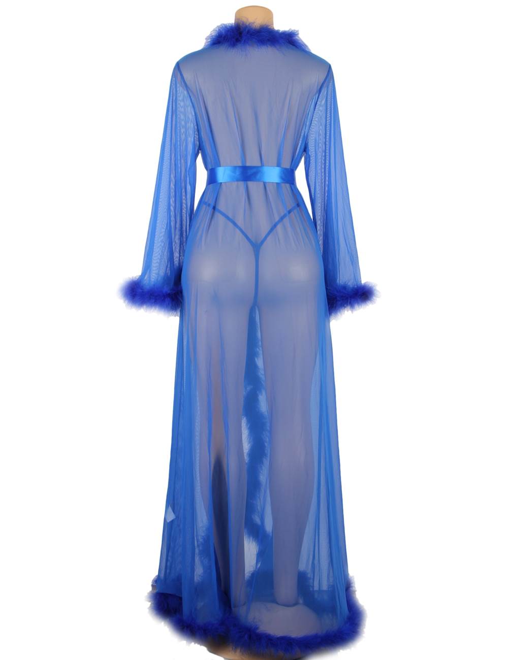 Product Name Blue Sexy Plush Edging Mesh Robe With Belt