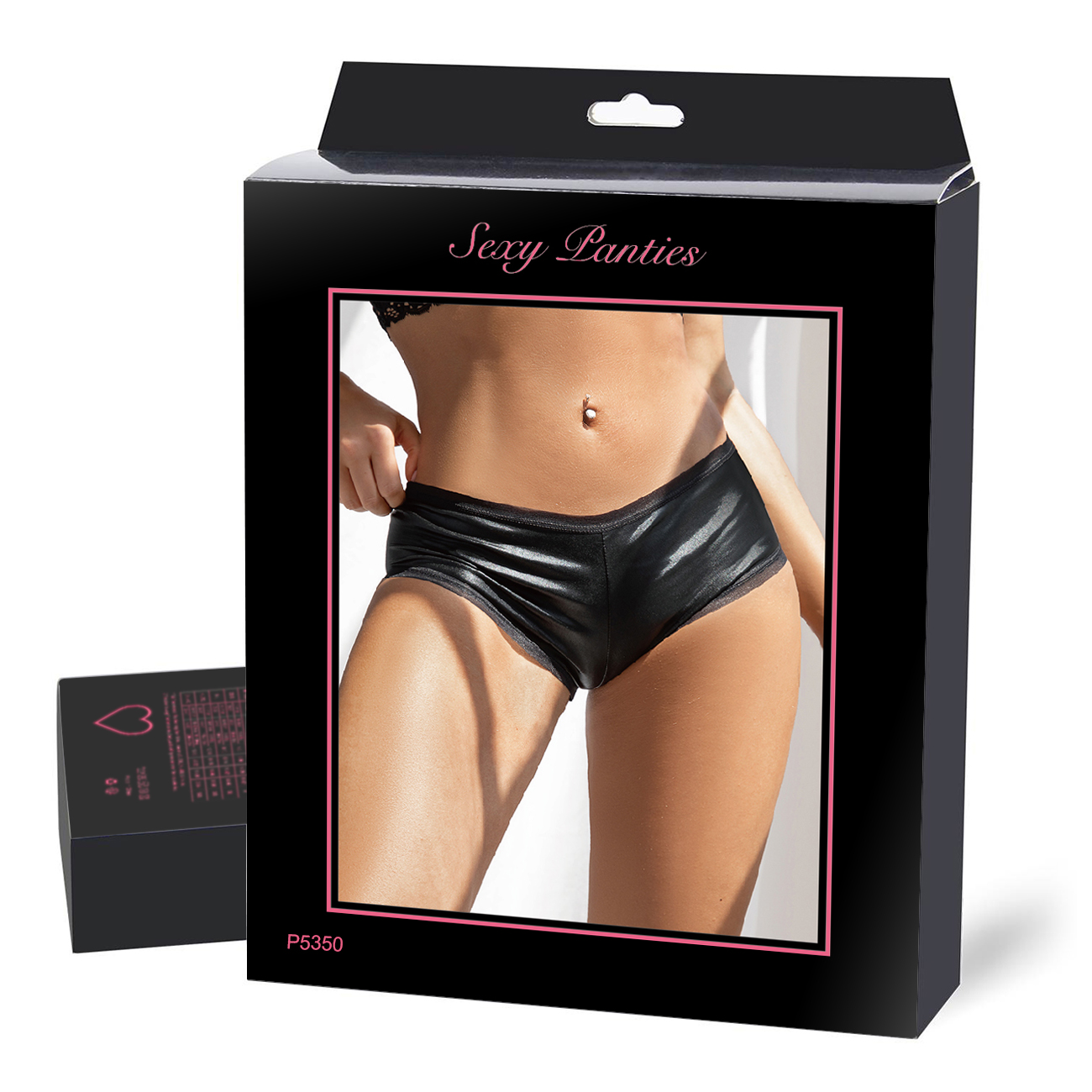 Standard product name: Black PU leather, elastic rubber at the waist and hem, pleated centerline on the hips, with cotton lining, M-3XL, sexy leather underwear.