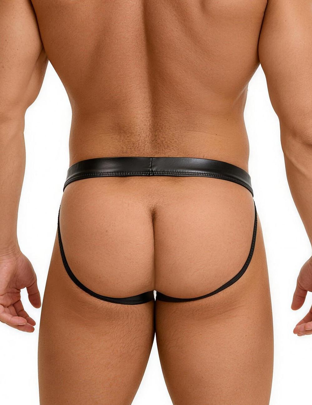 Crafted from PU leather fabric for a stylish, sleek look. Features a front U-shaped pouch design for a sexy, comfortable fit. Triangular cut offers simplicity and comfort. The crotch features an openable snap closure for convenient access and a unique touch. Dual thong design provides a comfortable, butt-lifting effect.