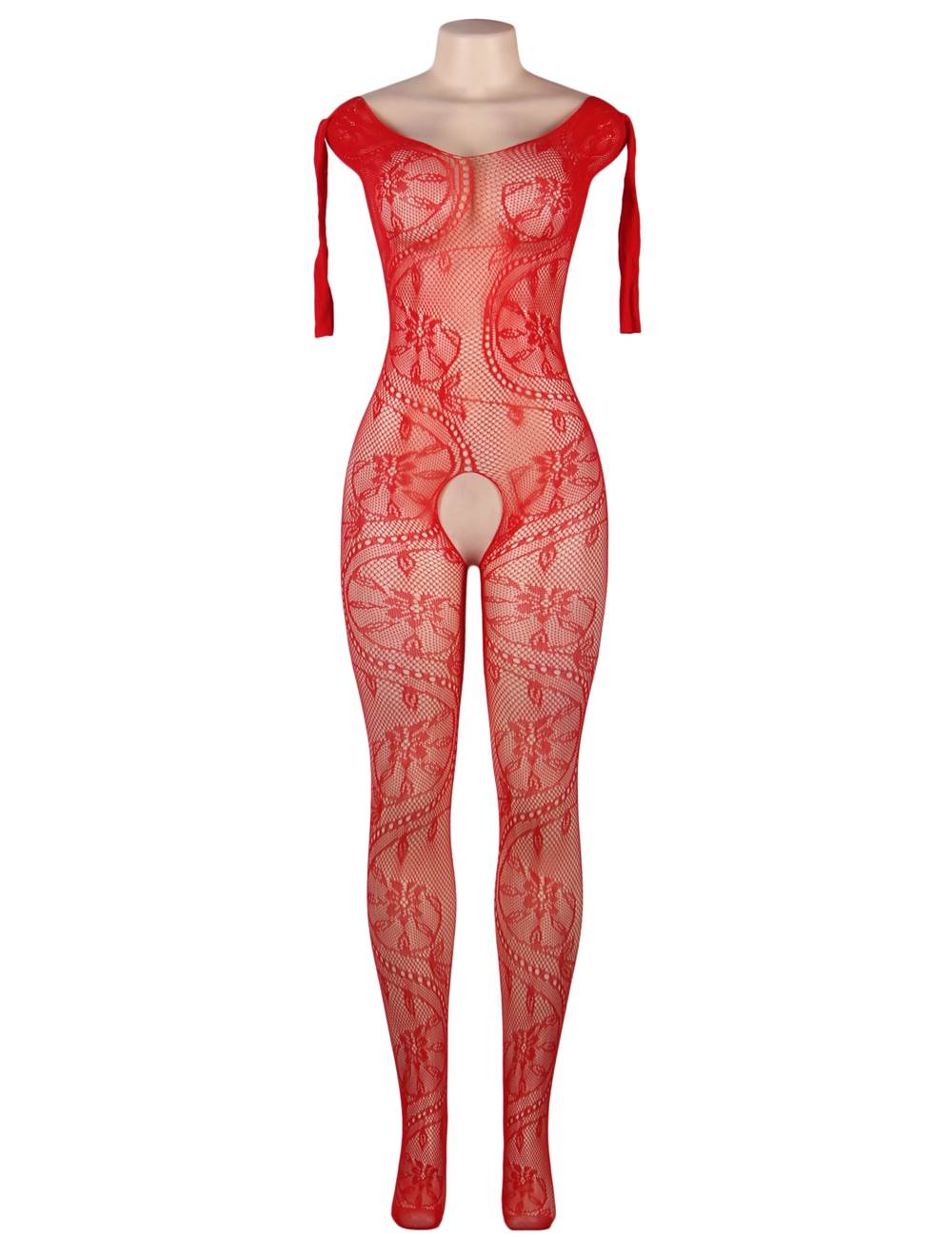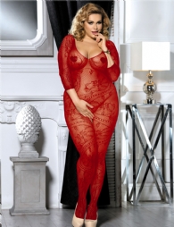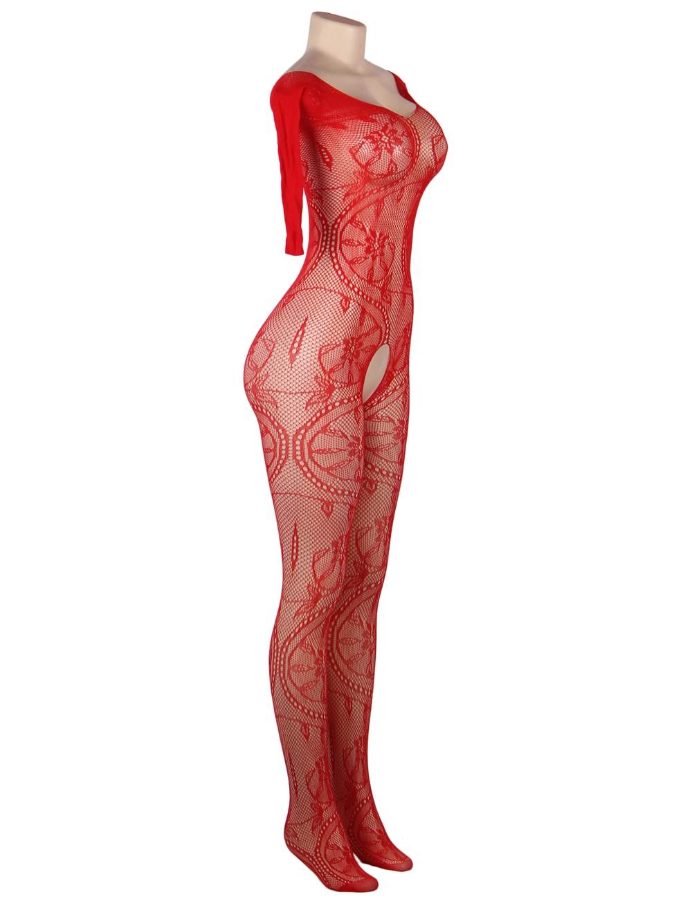Standard product name: Available in black, skin color, and red, made of high-elasticity nylon fiber, long sleeves, patterned, hollowed-out crotch, M/XL, two sizes, sexy bodystocking.