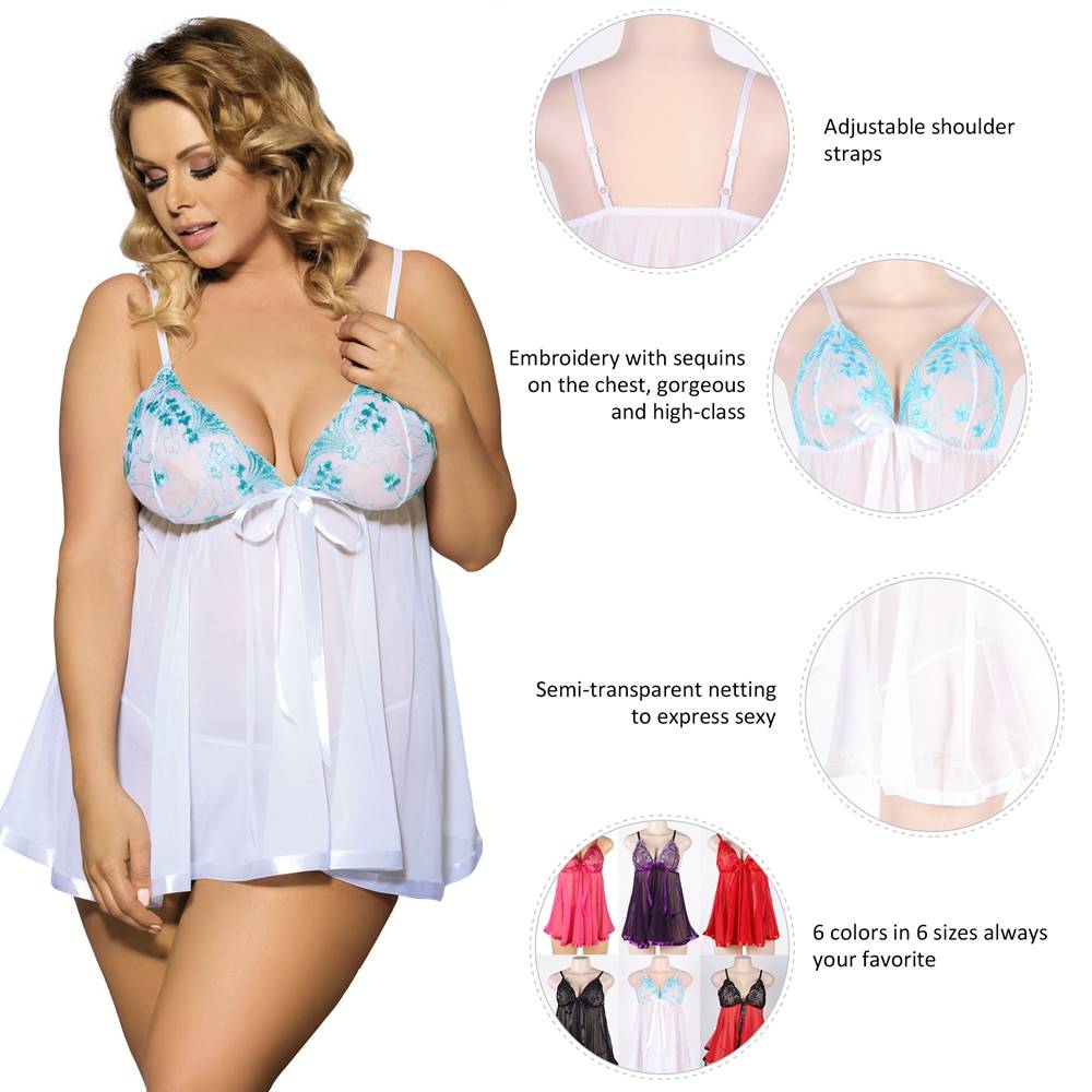 Introducing the latest addition to Ohyeah’s plus-size lingerie collection, the E20732P babydoll. This stunning piece boasts a range of features that make it a must-have for any lingerie enthusiast. One of the standout features of the E20732P is its adjustable shoulder straps, which ensure a comfortable and personalized fit for women of all shapes and sizes. The straps also add a touch of elegance and sophistication to the overall design of the babydoll. The front of the babydoll is adorned with exquisite embroidery and sequin embellishments, adding a touch of glamour and luxury to the design. This makes it perfect for special occasions or a romantic evening in. The sheer mesh fabric of the babydoll is both sensual and feminine, showcasing just the right amount of skin to make any woman feel confident and alluring. With six different colors and sizes ranging from S to 6XL, there is a perfect fit for everyone. The set also includes a matching thong that perfectly complements the overall design. Made from the same soft and smooth material as the babydoll, the thong ensures a comfortable fit that won’t detract from the overall look. Overall, the E20732P babydoll is the perfect choice for any woman looking for a comfortable, luxurious, and sensual lingerie piece. Whether for a special occasion or simply to feel confident and beautiful, this babydoll is sure to impress.
